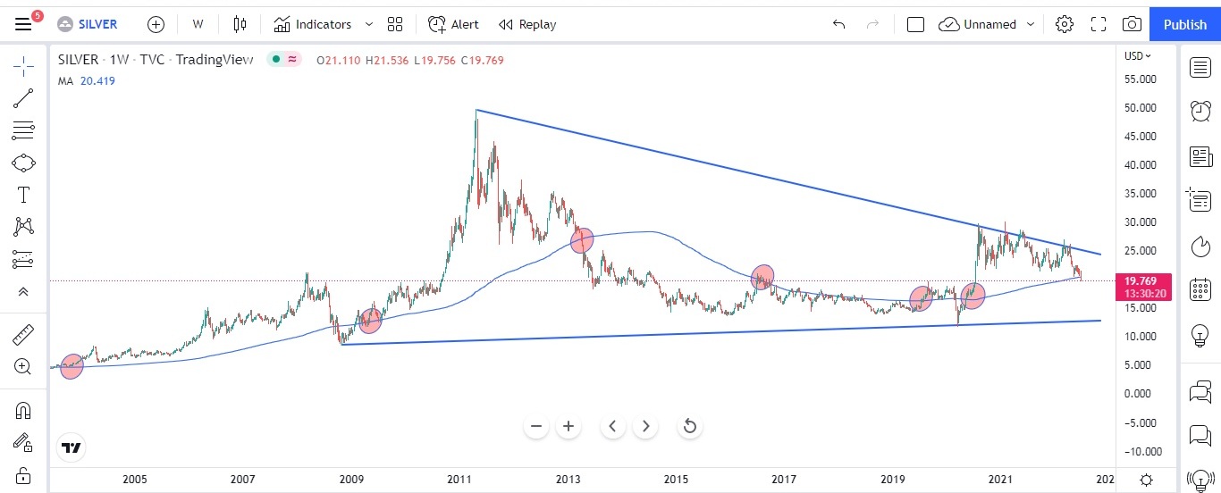 Below chart of silver is on a weekly time frame plotted with Simple Moving Average (SMA -200). One can also see the price of silver is trading in a channel (two blue lines). When price of silver crossed the SMA -200 line, the price of silver was trading at $ 12.5/OZ (April 2009) and rallied up to $ 49.83 /OZ (April 2011). During, the pandemic most of the investor invested their capital either in gold or silver and one can see from the below chart the price of silver took support just below the SMA-200 and it did not cross the low of 2009. That is where most of the investor invested since the prices at that moment was trading at nearly 10 years low and there was a dropped down of almost 75% in the prices of silver.