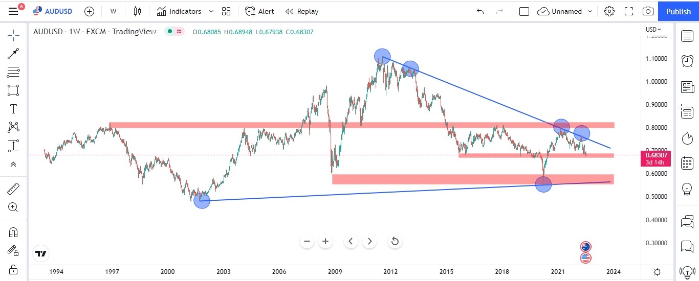 It was during the year 2009 to 2012 the prices has outperformed and the AUDUSD made an all time high of 1.10802 in the year 2011. Since then the prices are making new lower low and in fact it has also tested the key support area that has formed during the year 2008. In 2008, when the world market had recession, the prices made the low of 0.60212 and same has been retested during the Corona Pandemic 2020 by breaking the low of 2008 and one can clearly see, it took support from that levels and since then the prices were in uptrend till it got a strong resistance at the upper trend line drawn from the all time high.