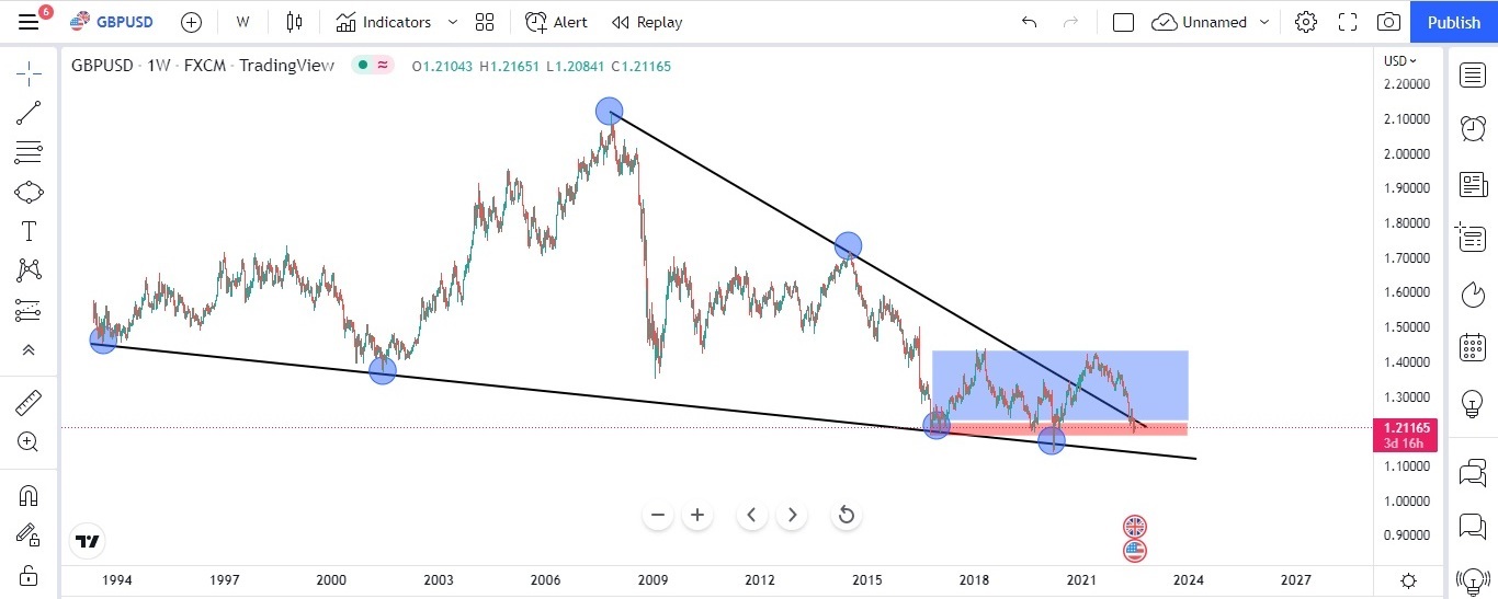 It was during the year 2007 when GBPUSD has outperformed and made an all time high of 2.11612. Since then, the prices are making lower lows and lower high. Currently, the price is trading at 1.21167 and trading at key support level.